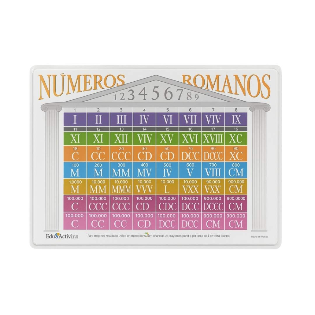 Facilita el aprendizaje de los números romanos de forma clara, visual y didáctica con esta lámina autodidáctica, ideal para apoyar el proceso educativo de niños y estudiantes en edad escolar.